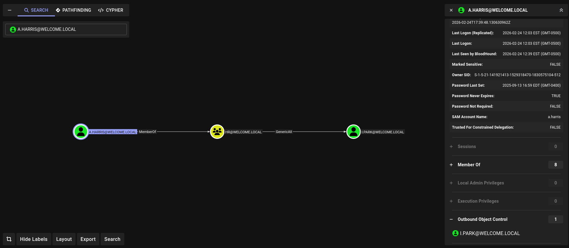 The analysis showed that my user a.harris had GenericAll rights over the user i.park.