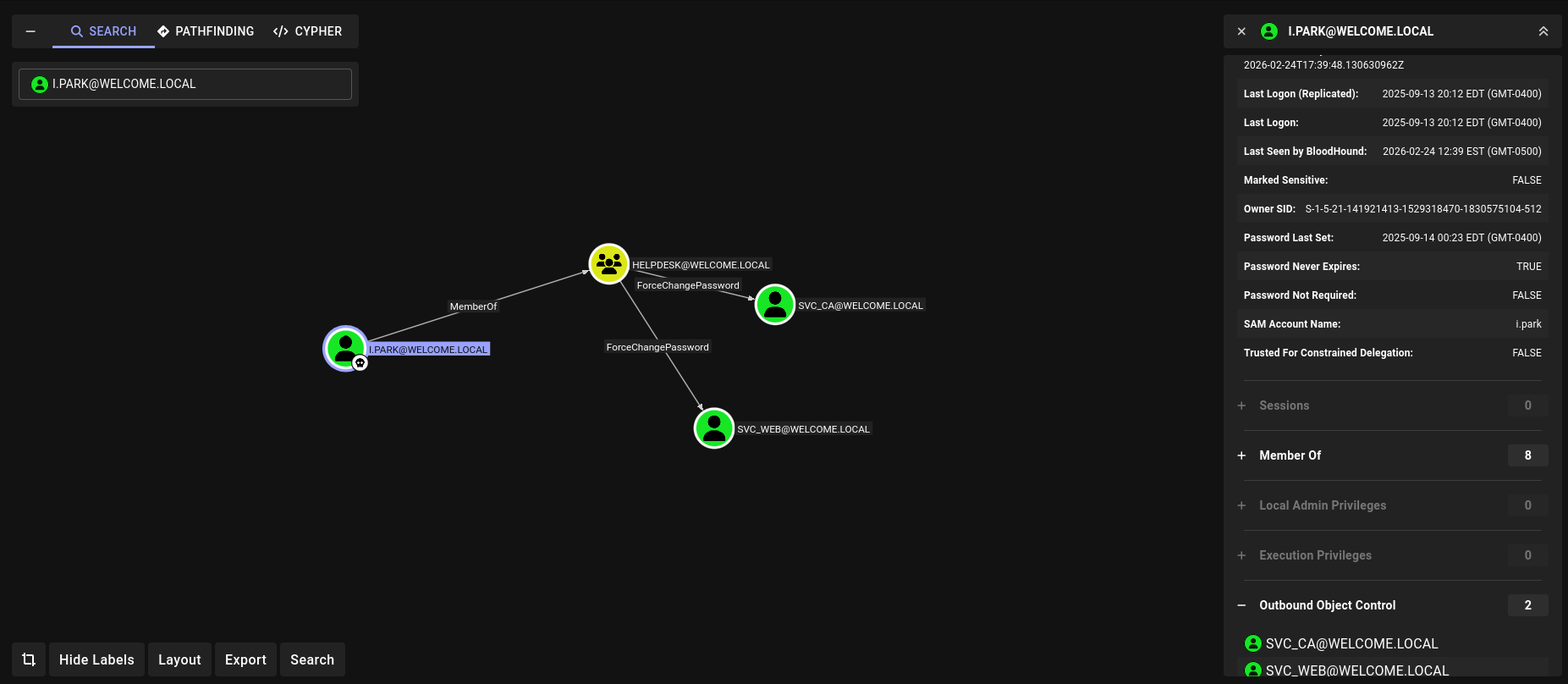 With control over i.park, I checked their outbound permissions in BloodHound. This user had ForceChangePassword rights over the svc_ca service account.