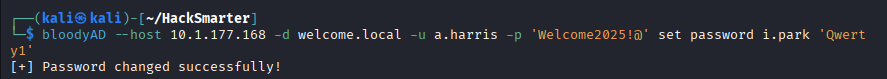Leveraging the GenericAll permission, I used BloodyAD to force-change i.park's password.