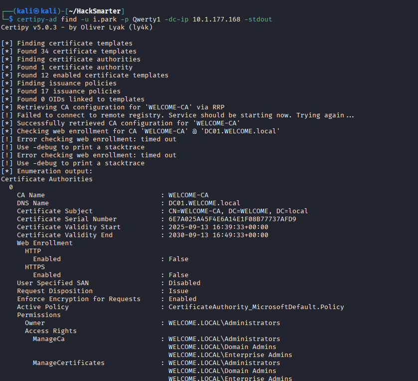 The svc_ca account implied the presence of Active Directory Certificate Services. I used Certipy to enumerate the available certificate templates.