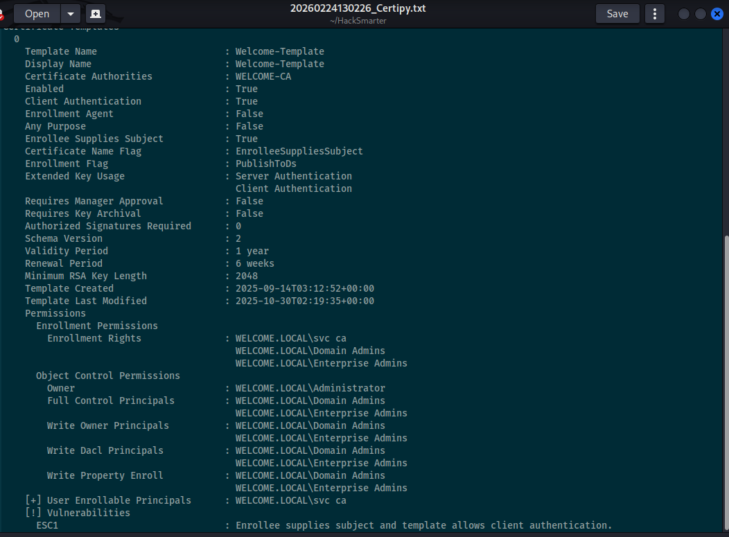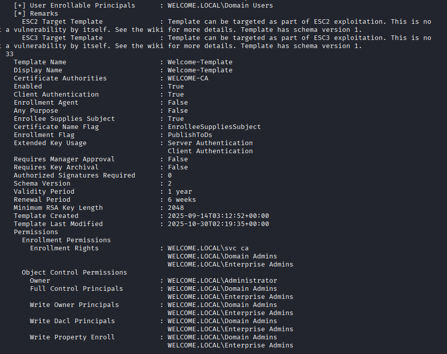I discovered a custom template named Welcome-Template. A deeper analysis confirmed it was vulnerable to ESC1 (Enrollee Supplies Subject + Client Authentication).