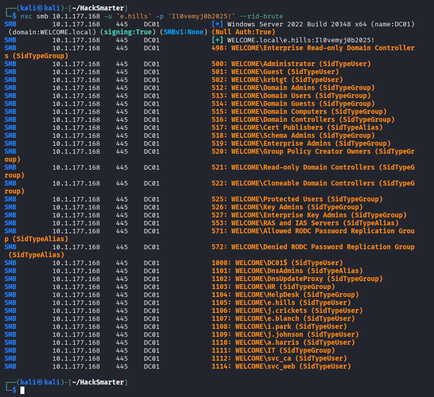 With a potential password candidate, I needed a list of valid users. I used NetExec to perform a RID brute-force to dump valid domain users.