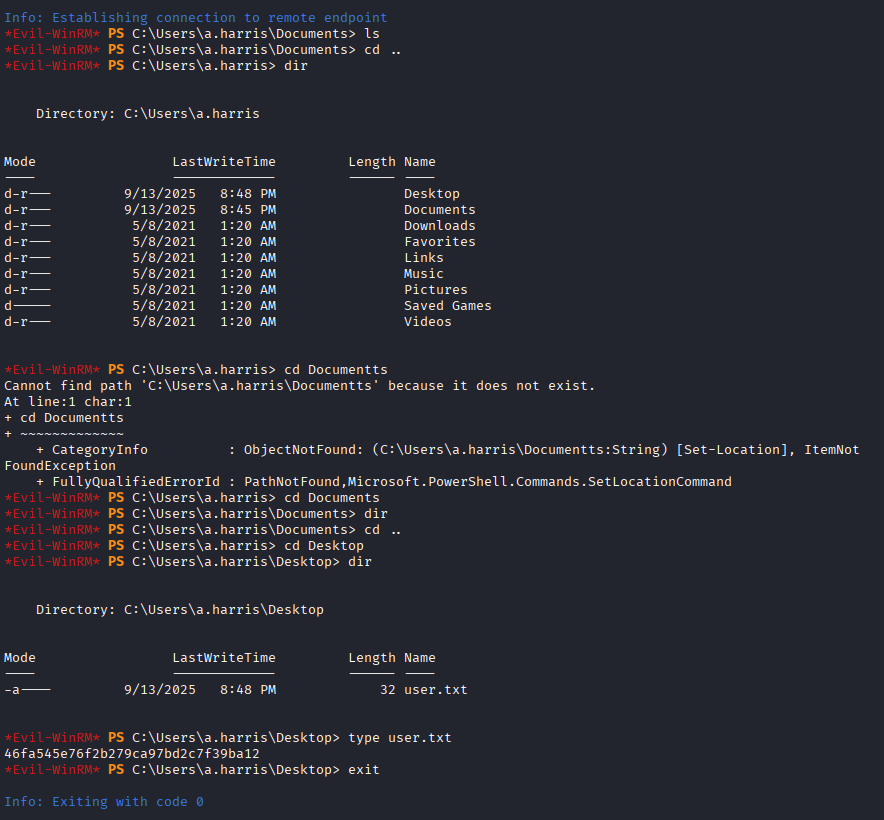 Using Evil-WinRM, I logged in as a.harris and retrieved the user flag.