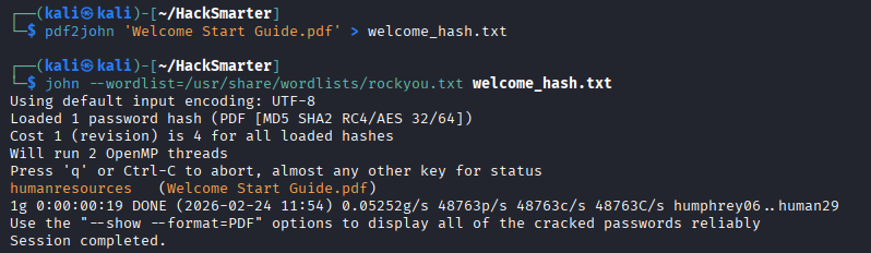 To access the protected content, I extracted the hash using pdf2john and cracked it using John the Ripper. The password was revealed to be humanresources.