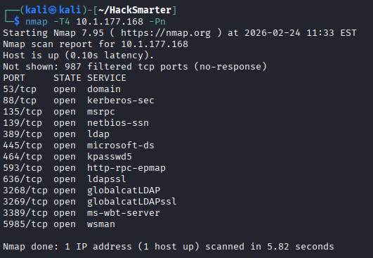 I started by scanning the target to identify running services. Nmap confirmed the presence of a Domain Controller with standard ports (DNS, Kerberos, LDAP, SMB) and WinRM open.