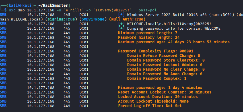 Before spraying, I checked the Domain Password Policy to ensure I wouldn't lock out accounts. The policy was lenient with no strict lockout threshold.