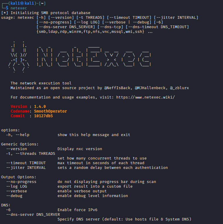 v1.4.0The "Smooth Operator." The modern fork of CrackMapExec. It is the swiss-army knife for enumerating AD protocols (SMB, LDAP, MSSQL, WinRM).