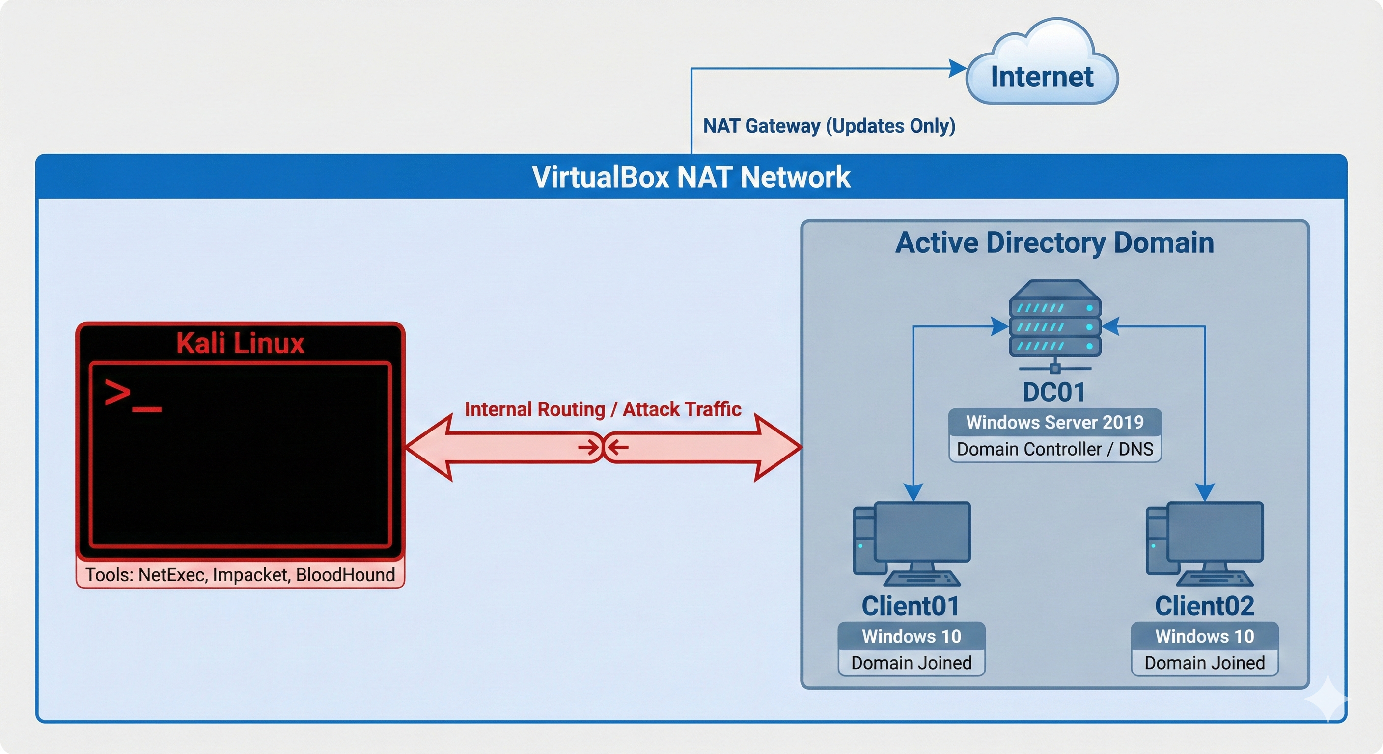My priority was to establish a realistic but isolated network; I configured the network adapters to use an internal "NAT Network." This ensures the machines can communicate with each other and reach the internet for necessary updates, while keeping the vulnerable Active Directory services segregated from my main home network.