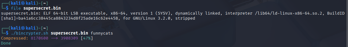 The screenshot above shows the obfuscation process. Bincrypter compresses and encrypts the original binary into a shell script. In my testing, this effectively masked the executable from static analysis tools, as the payload appeared as a high-entropy data blob rather than a known malicious file format.