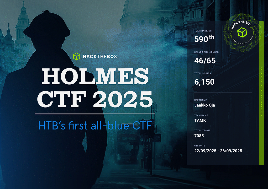 We took part in the Holmes 2025 CTF organized by Hack The Box. My team consisted of fellow classmates from our CyberOps course. The event focused entirely on the Blue Team, and this was the first-ever all-Blue CTF event organized by Hack The Box. It was our first time participating in a CTF, and we performed very well -> we captured a total of 46 flags out of 65!